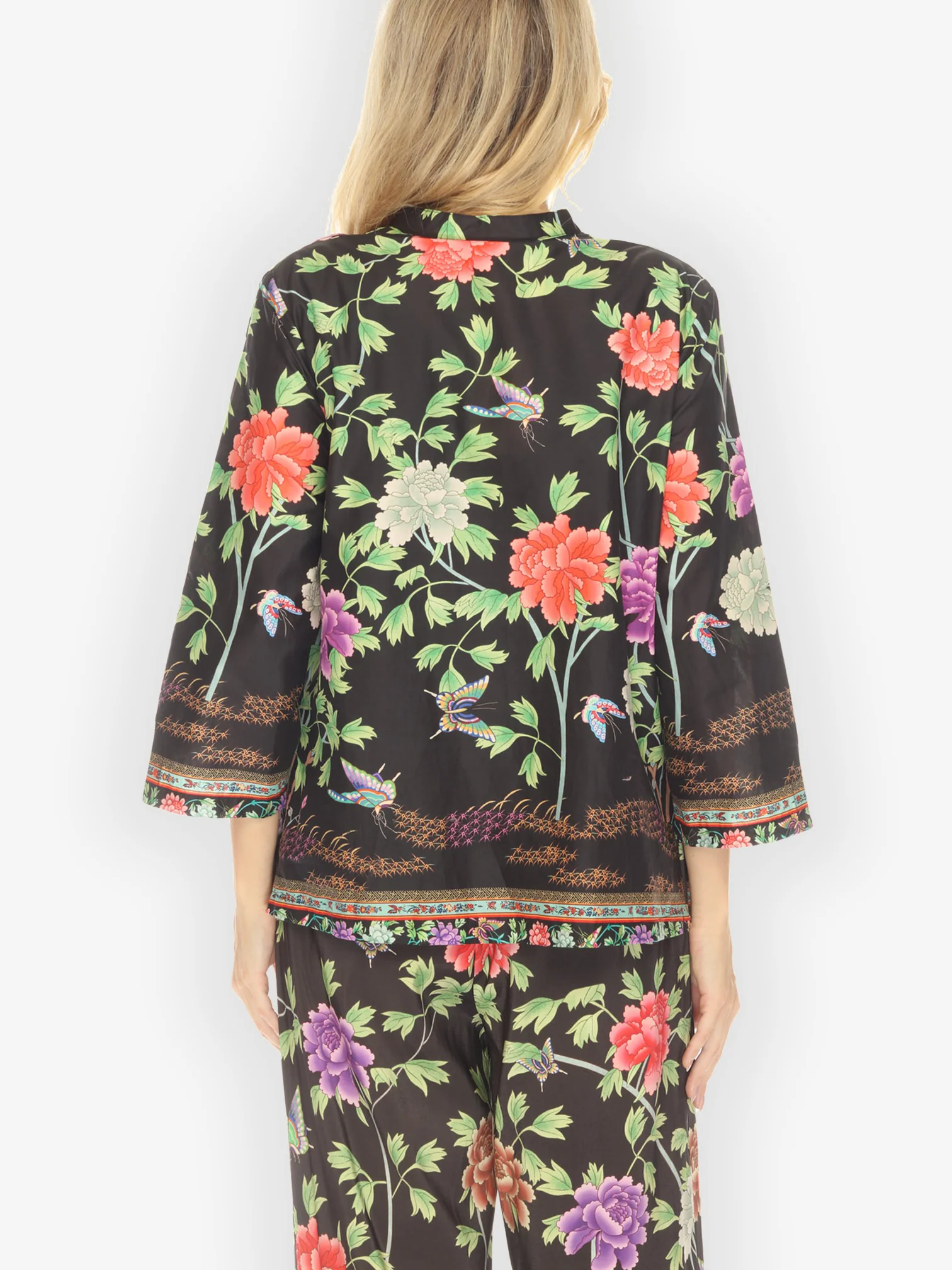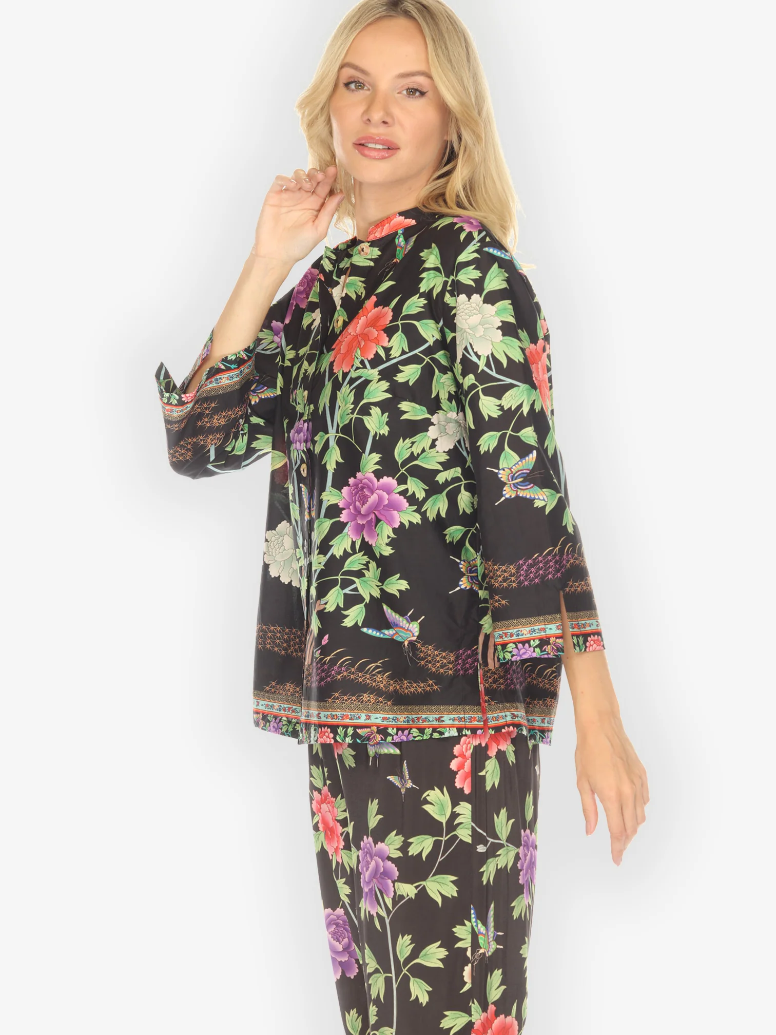 Border Floral Butterflies in Black Cotton Blouse