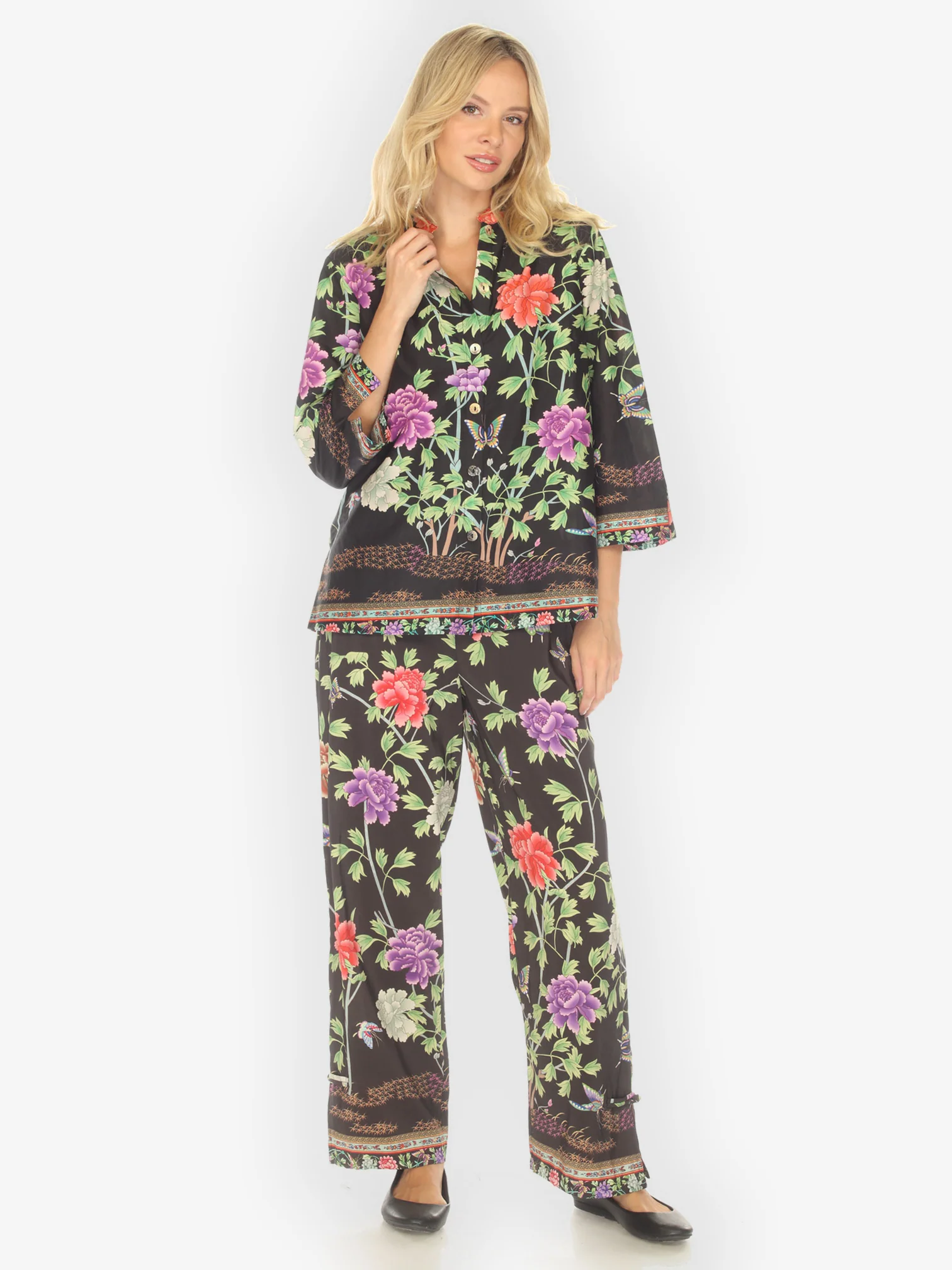 Border Floral Butterflies in Black Pull on Pant